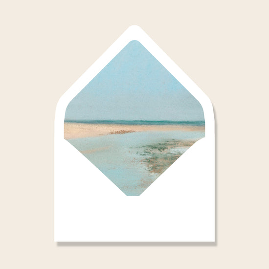 This envelope liner features Beach at Low Tide (Mouth of the River) painted in 1869 by Edgar Degas. Soft washes of sky blue and sand capture the serenity of a still shoreline, evoking a quiet day by the sea. Ideal for coastal weddings, summer correspondence, or anyone who dreams in pastels and sea breeze.