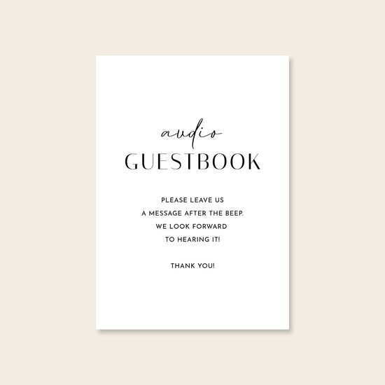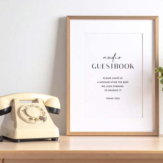 This editable audio guestbook sign template is the perfect way to guide your guests to leave heartfelt voice messages on your audio guestbook. A stylish, modern way to preserve personal moments and well wishes from your special day.