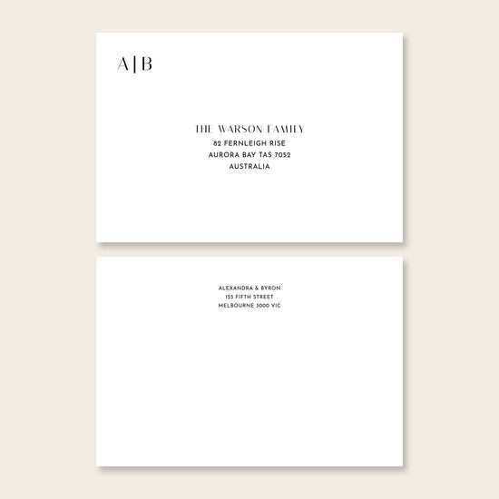 This printable template includes both front and return address layouts, making it easy to add a refined touch to your envelopes. Whether you're printing at home or through a professional service, the template is sized for popular envelope sizes from our favourite suppliers, MOO and Peterkin.