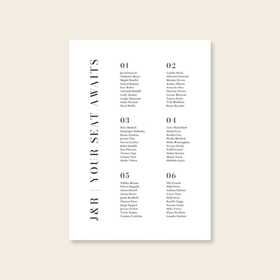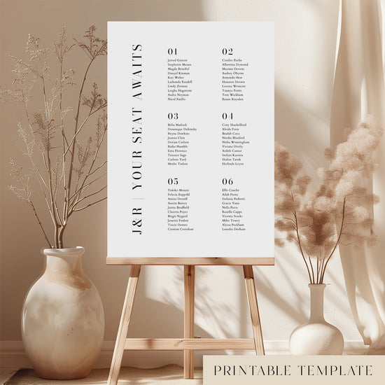 Perfect for traditional round table receptions, this seating chart template lists each table with corresponding guest names for easy, elegant organisation. Best suited for weddings with six tables or fewer.