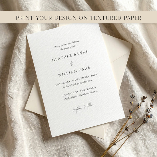 This editable invitation template makes it easy to create a stylish and personal wedding invite. It includes matching Details and RSVP card templates to keep your stationery feeling cohesive and intentional.