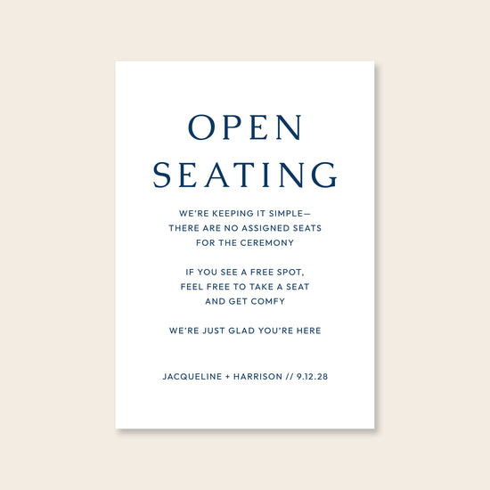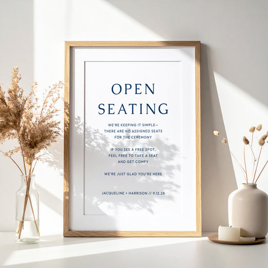 This editable open seating sign template is a handy way to guide your guests to find their seats at your ceremony, whether you have open seating or reserved areas.