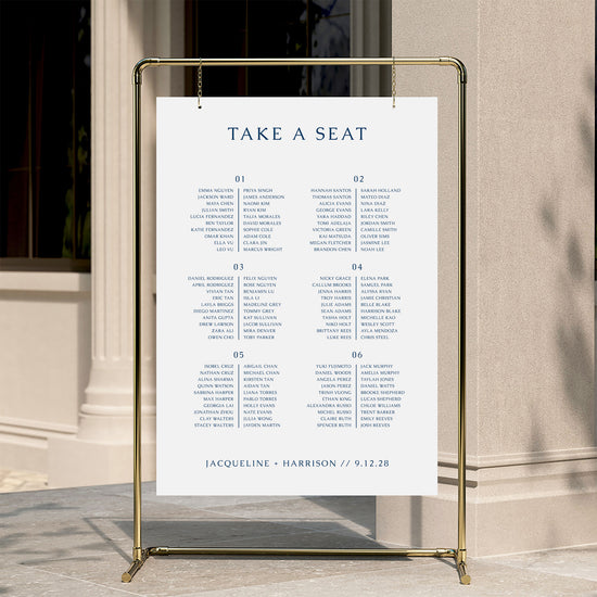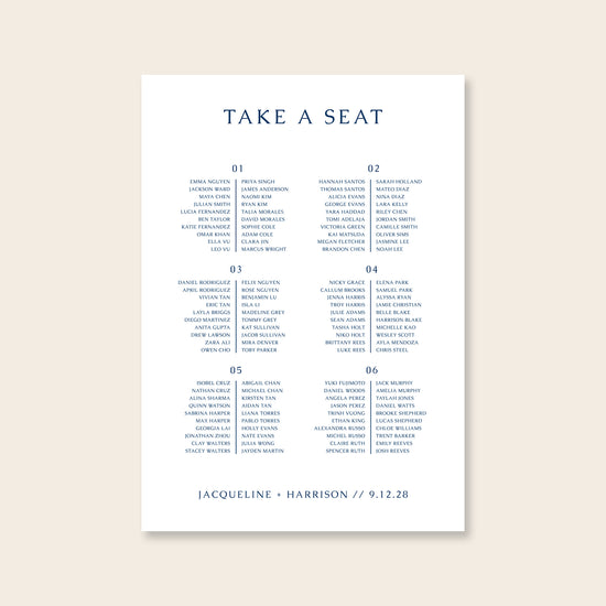 Perfect for banquet or long table receptions, this seating chart template displays guest names neatly on either side of the table for a stylish, easy-to-read format.