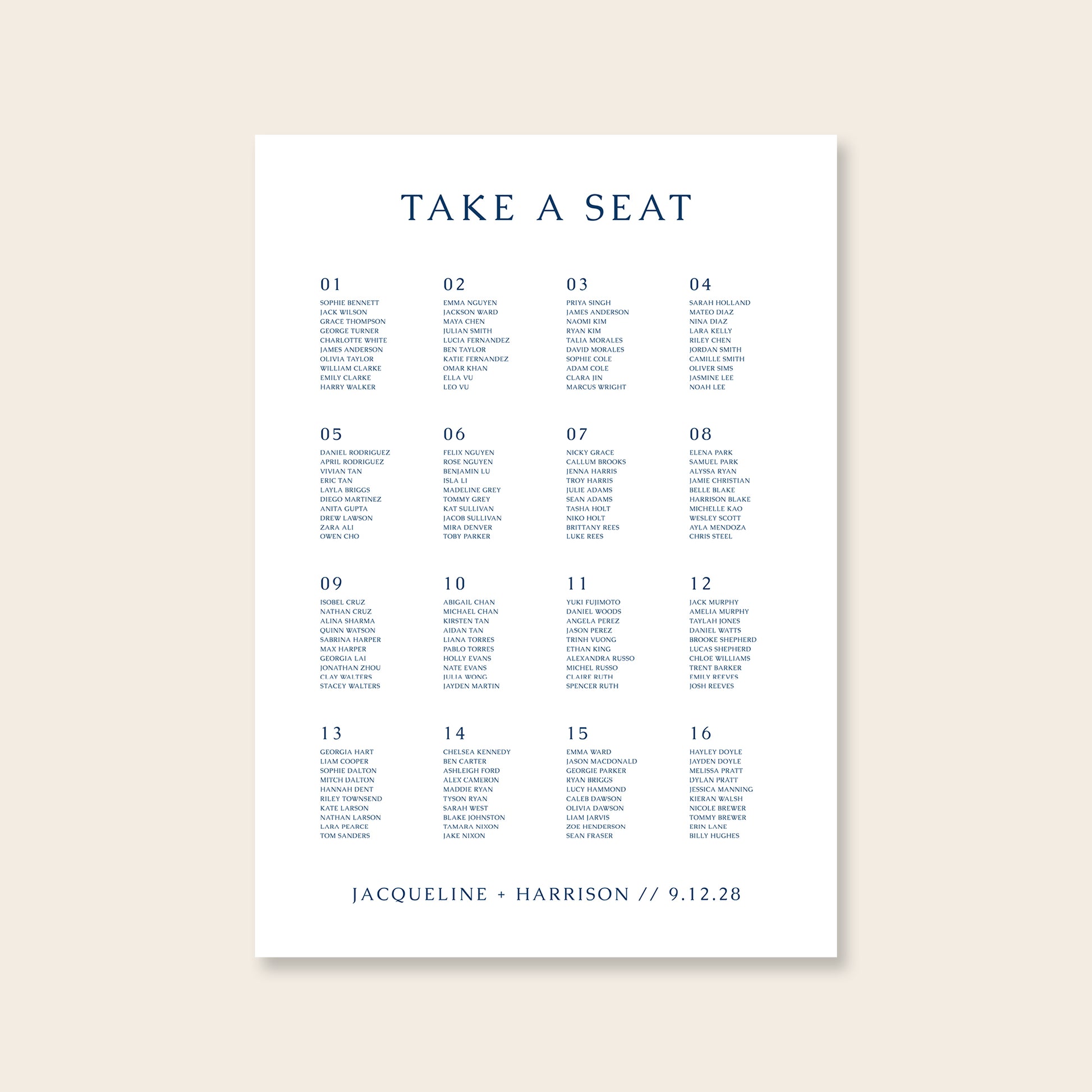 Perfect for traditional round table receptions, this seating chart template lists each table with corresponding guest names for easy, elegant organisation.