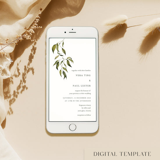 The invitation is designed for mobile viewing and can be downloaded to share via text, email, or alongside your own wedding website.