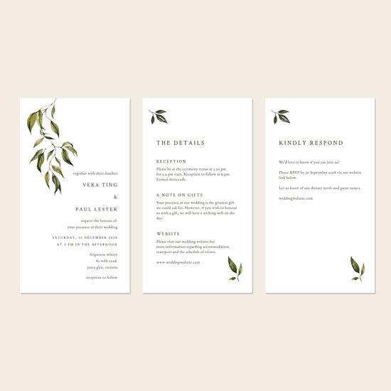 The Evergreen collection adds a touch of natural elegance to your wedding day with delicate foliage illustrations and sophisticated typography.