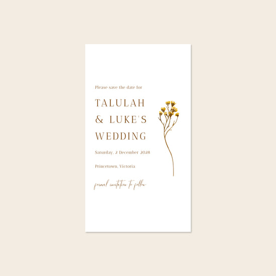 Goldfields is a tribute to Australia’s golden heartland. Inspired by the Wheatbelt and open skies of regional towns, this design evokes the warmth and charm of country celebrations. With its hand-drawn botanical detail and gentle, sunbaked palette, it feels right at home in homestead halls, heritage farms, and rustic outdoor settings.
