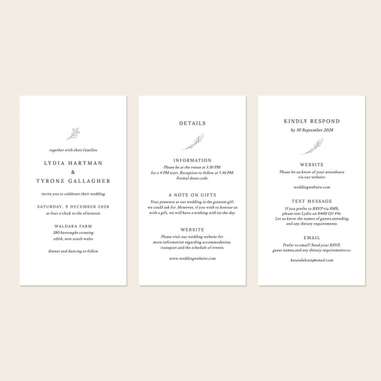 This editable digital invitation template set includes the main invite, matching details and RSVP pages, plus ten extra blank pages for any additional information you’d like to include.