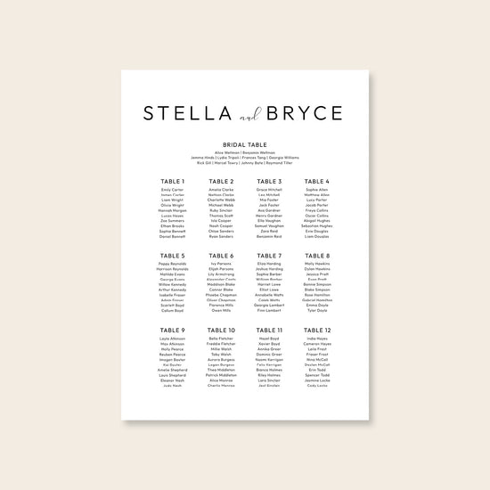 Perfect for traditional round table receptions, this seating chart template lists each table with corresponding guest names for easy, elegant organisation.