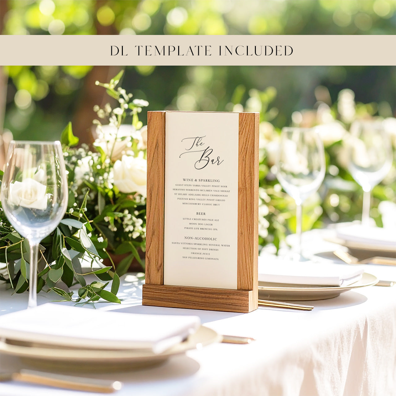 - Editable DL (99mm x 210mm) template – Perfect for placing on individual cocktail tables or at the bar for a sleek, space-saving drinks menu.