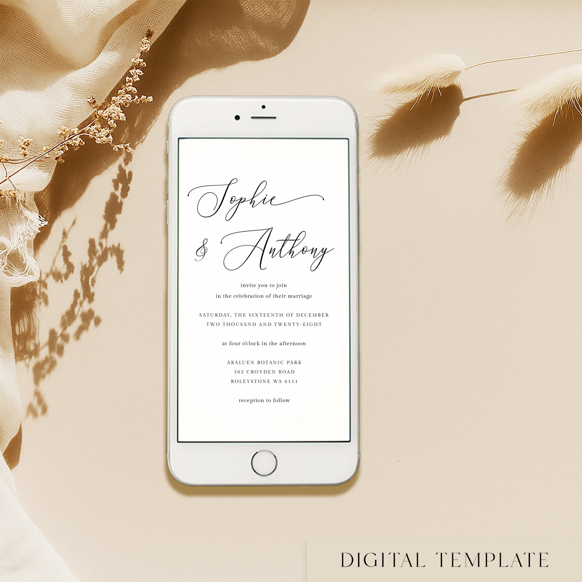 The invitation is designed for mobile viewing and can be downloaded to share via text, email, or alongside your own wedding website.