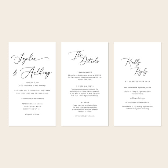 This editable digital invitation template set includes the main invite, matching details and RSVP pages, plus ten extra blank pages for any additional information you’d like to include.