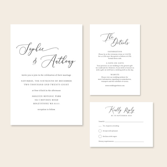 This editable invitation template makes it easy to create a stylish and personal wedding invite. It includes matching Details and RSVP card templates to keep your stationery feeling cohesive and intentional.