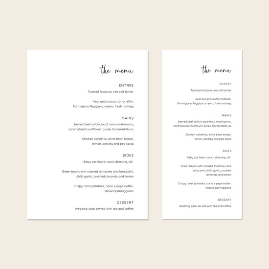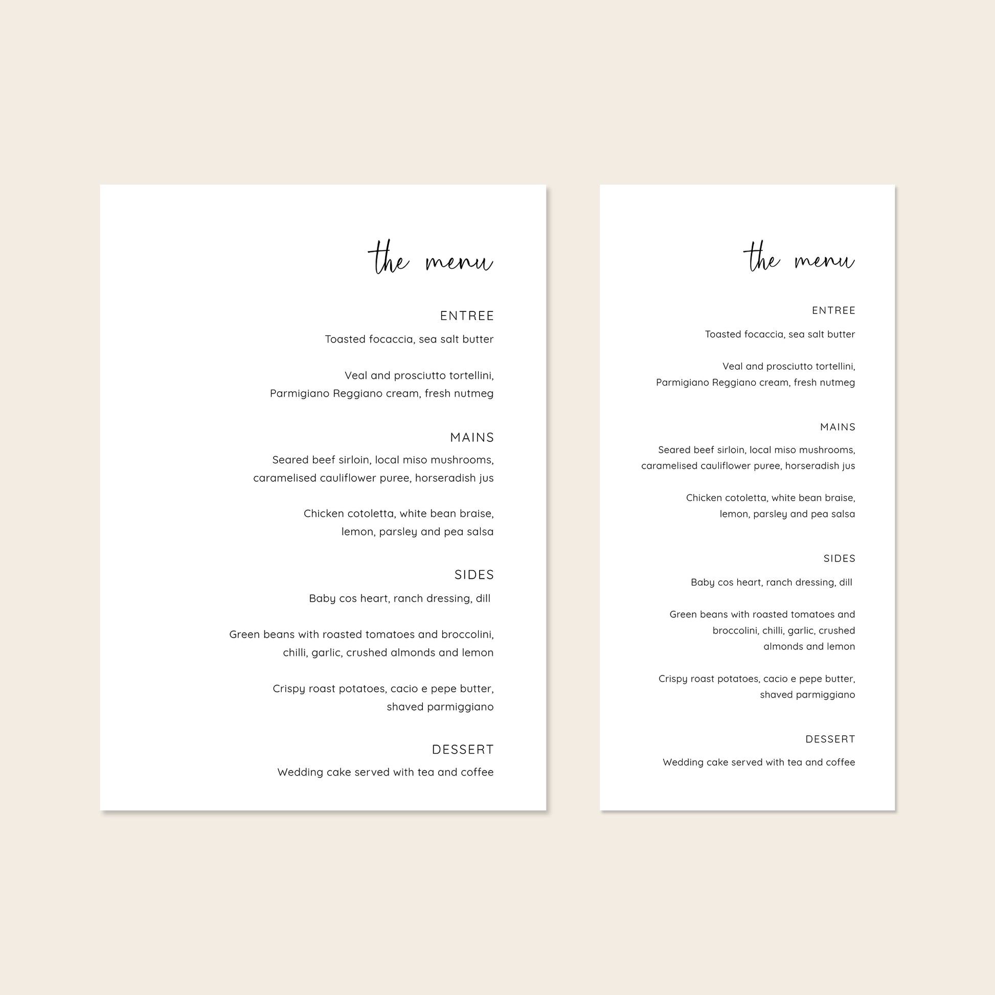 - Editable A5 (148mm x 210mm) template — A slightly larger option, ideal if your menu includes multiple courses or detailed descriptions.